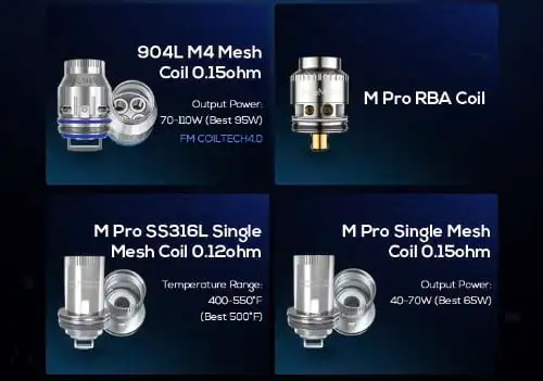 The kit includes the M Pro 3 tank with multiple coil options, including 904L Mesh Pro and the original Mesh Pro coil series.