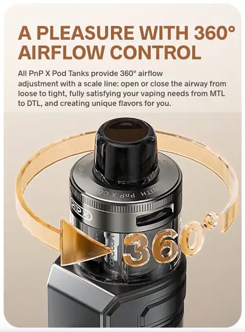 The PnP cartridges provide 360° airflow adjustment with the ability to open or close the airway from loose to tight, fully satisfying your vaping needs from MTL to DTL and creating a unique flavour experience from your chosen e-liquids.